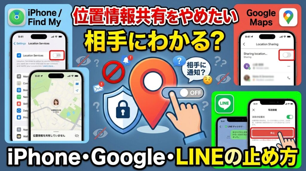 Appleは現行の案内で停止時通知なしとしていますが、一覧から消えることで相手が変化に気づく可能性はあります。Googleは停止後に表示が消えることは確認できても、停止時通知の有無を公式で断定確認できません。LINEはそもそも継続共有とは限らず、送信済みの位置情報が残ることがあります。