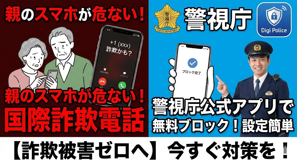 親のスマホに詐欺電話が来る方へ!警視庁Digi Policeで国際電話を無料ブロックする方法