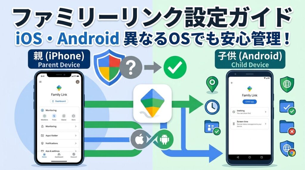 本記事では、親がiPhone・子どもがAndroidの見守り設定について、Family Linkでできること、できないこと、最初の設定順序をわかりやすく整理します。(専門知識は不要です!)